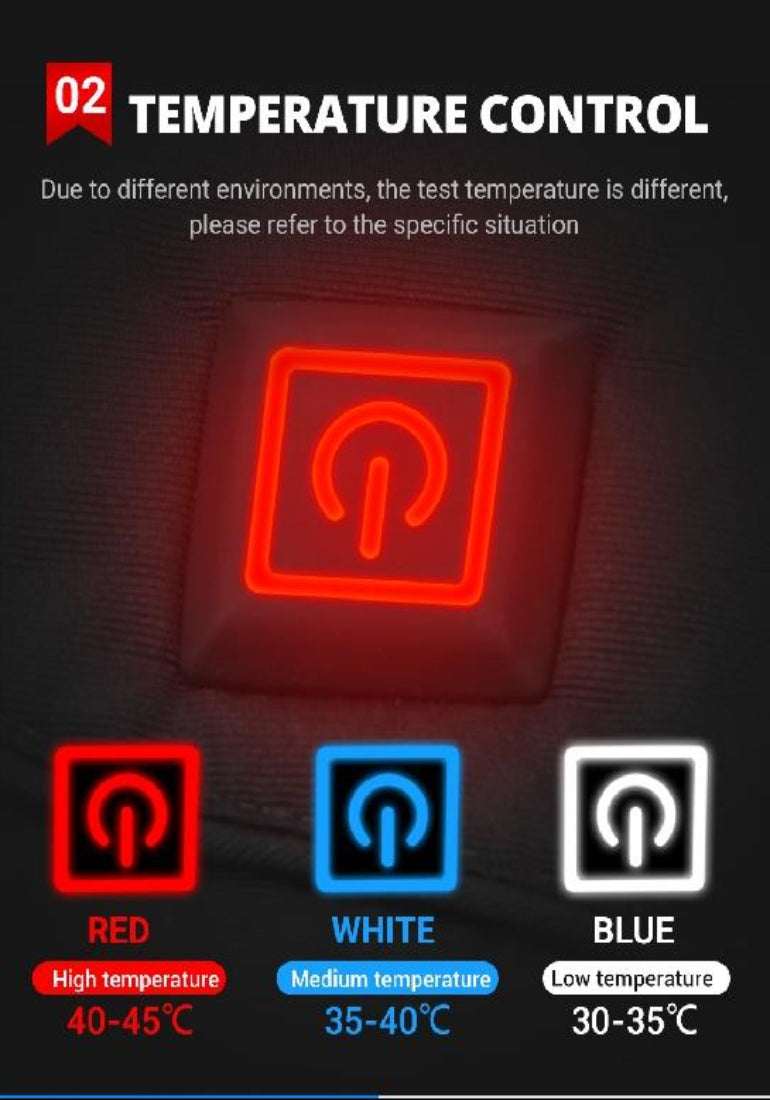 3.Temperature Levels: Hold 3 seconds to start or close. 3 temperature levels, red high temperature 40-45℃, white medium temperature 35-40℃, blue low temperature 30-35℃.